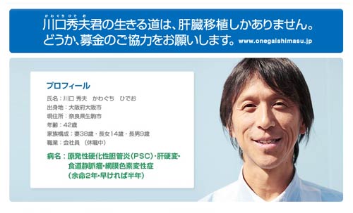 仕事や家族のために、毎日がんばっていた川口さんが、突然倒れたのは今年の6月でした。食道の静脈瘤が破裂し、大変危険な状態になりました。一命をとりとめた後も、再び食道静脈瘤が破裂し、精密検査の結果、原発性硬化性胆肝炎と判りました。治療の難しい病気で、残された治療方法は肝臓移植のみという状況です。