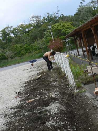 雨が降ると、駐車場の砂利が花壇に流れ込んでしまうので、土留めをしています。もちろんこういうときは、一番若いハチ選手の登板です。ご苦労様です!