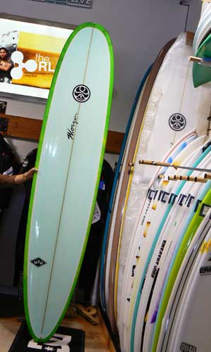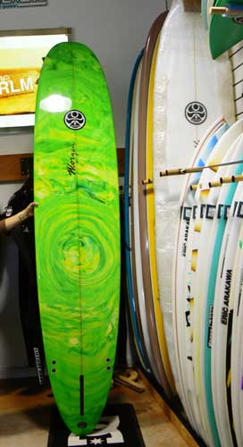 これは、オールラウンドタイプ。ティントカラーがキレイです。遅くマッシーな波からほれたリーフブレイクまでオールラウンドなロングです。長さは9’1”(277センチ) お値段は228,900円
