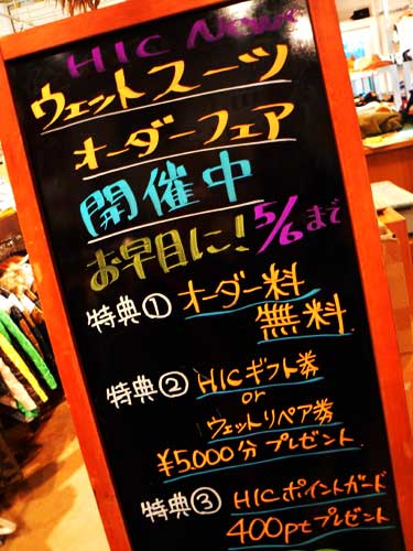 通常カスタムフルオーダーでウェットを作るとオーダー料がかかります。定価の10%です。オーダーフェアでは、これが無料になります。普通の値段で、自分にピッタリサイズになるというお得なフェアです。