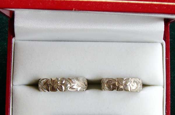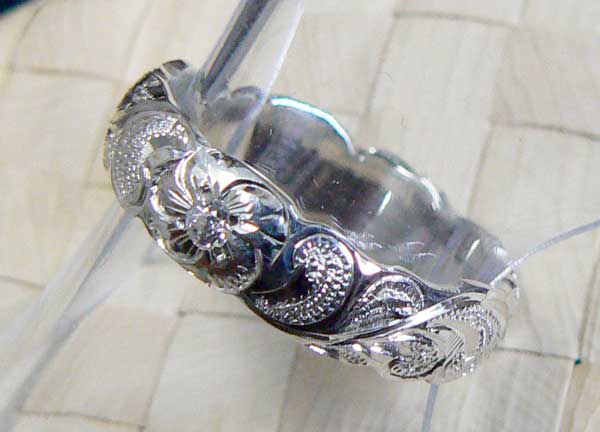 彫られている模様はプルメリアとスクロールの組み合わせでQUEENという名前が付いています。他にもいろいろな模様がたくさんあります。「こんな模様も入れたい」という希望もリクエストできます。