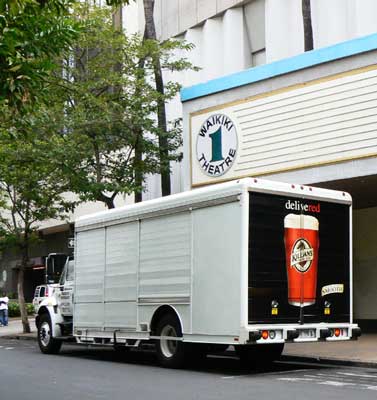 飲み物を運ぶトラックです。真っ白なボディーにバックドアだけ赤いアイリッシュビールなんて、クール!と思って、思わずパチリ。小さな男の子ならまだしも、いい大人の女が、あのトラックかっこいいーといってしまうワイキキの街角です。