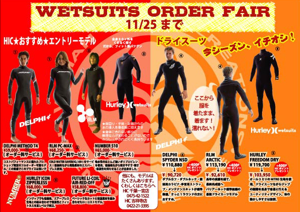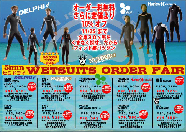 新素材生地の高性能モデルがたくさん登場。その中でも、特におすすめモデルを集めました。普通にオーダーするのに比べ、20%近くお得になっています。フルオーダーは、自分の体にピッタリなので、ウェットスーツの性能が100%発揮されます。さらに、サイズが合っているので、ウェットスーツの各パーツに無理な力がかかりません。ホツレやはがれなど、損傷しにくくなります。この時期にオーダーするのが得策ですよ。