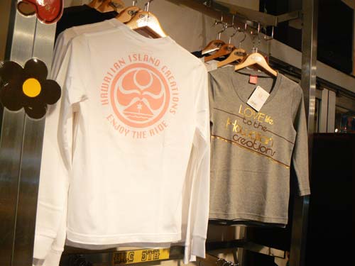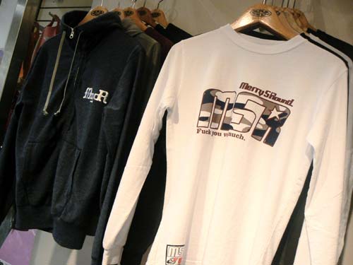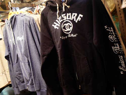 ハンガーにかかっているパーカー左はパイル地とパイピングがポイント。12,390円 右側はかがりステッチがポイント。同じく12,390円。