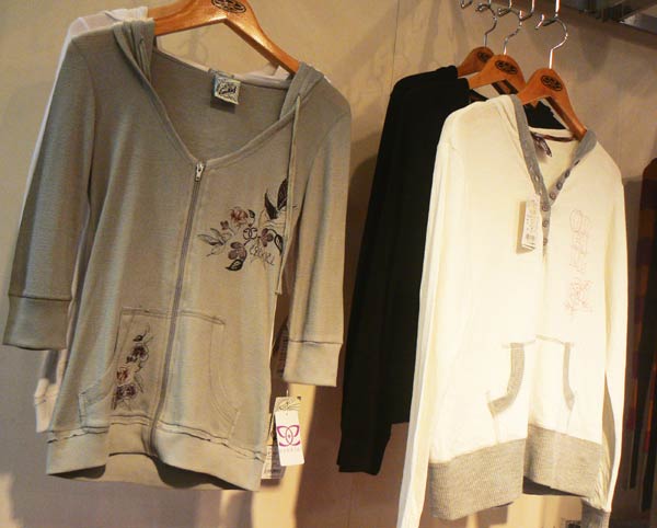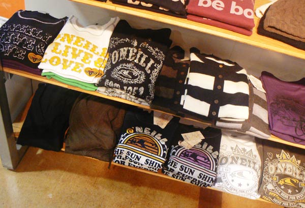 こちらはO'neillのロンT・トレーナー・ニット。ロンT(¥4,515~)やトレーナー(¥6,145~)のキラキラしたプリントやラインストーンがかわいいです。ニットはシンプルでシックです。いろいろにコーディネートできそうですよ~