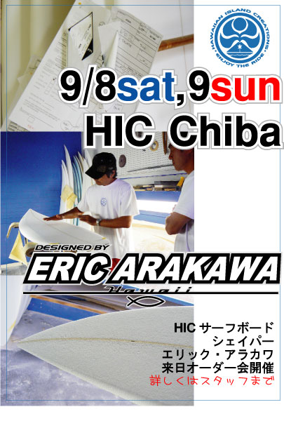 HIC Surfboard シェイパーのエリック・アラカワがハワイ・ノースショアから来日しますっ!9月8日(土)と9日(日)です。