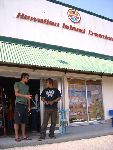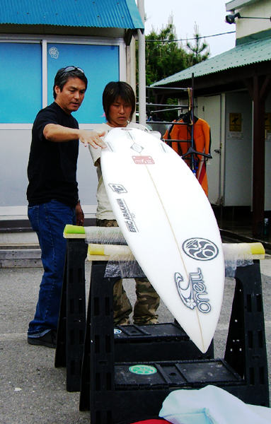 前回来日したときのEric Arakawaが高知県のプロサーファー谷口絵里菜とボードの相談をしているところです。かなーり真剣!当然ですが。