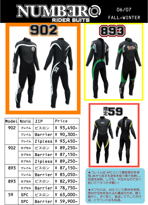このウェットスーツの冬モデルでは最高の保温性と運動性を両立させた902フレイムが一押しです。